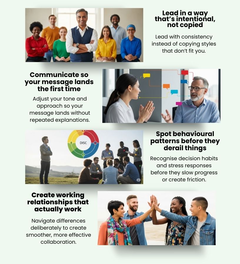 DISC helps you adapt your approach without pretending to be someone else. You’ll understand why certain interactions flow easily and where small shifts can dramatically improve outcome